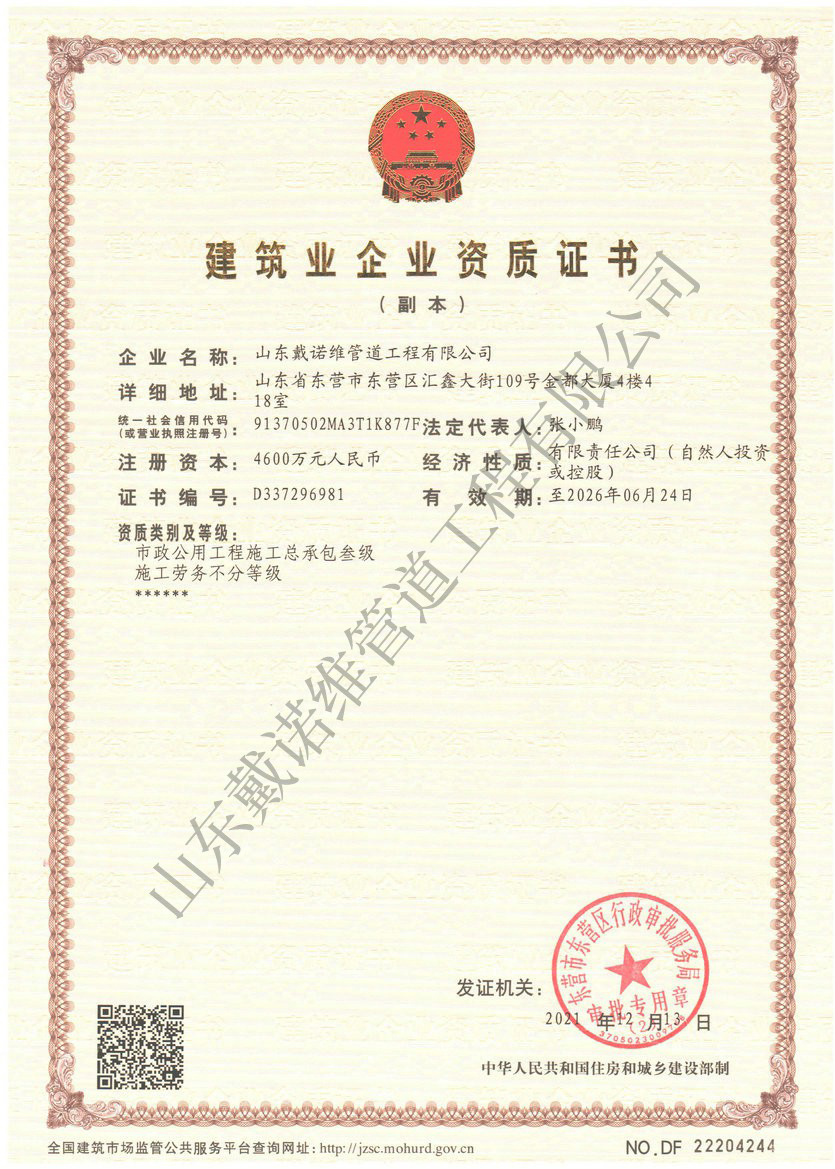 管道非開(kāi)挖修復(fù)工程服務(wù)企業(yè)資質(zhì)證書(shū)