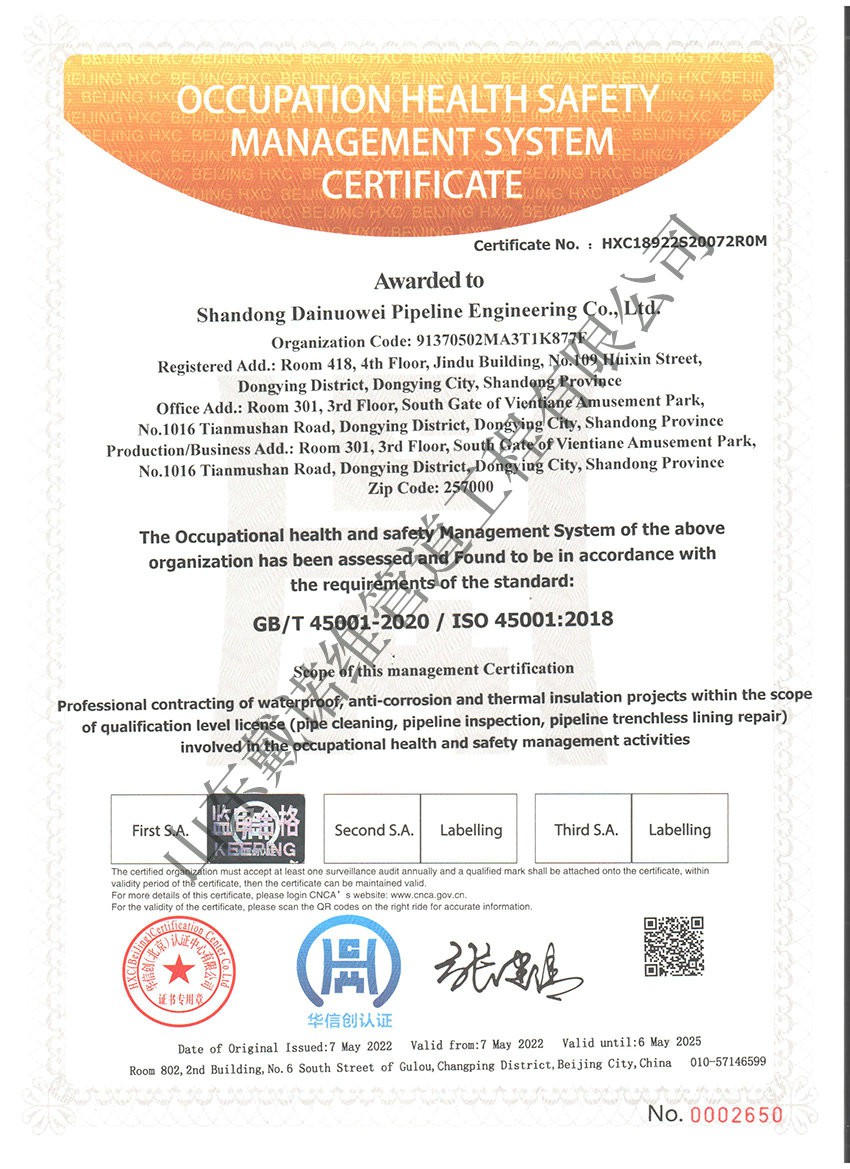 管道非開挖修復(fù)工程服務(wù)企業(yè)資質(zhì)證書